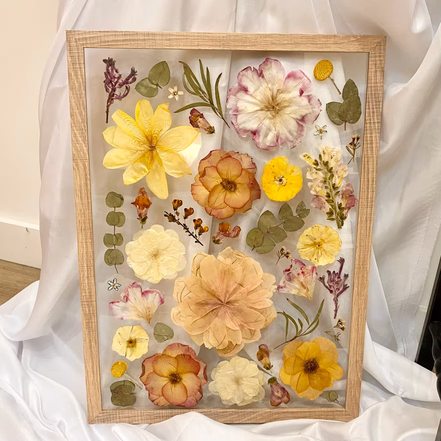 All of our frames are bespoke, handmade in house, wooden edged and contain glass. We aim to cater for all types of bouquets and currently offer the following options as add-ons: